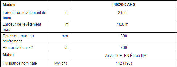 *selon l’épaisseur de revêtement, la largeur de revêtement et la vitesse de pose peuvent varier en fonction des conditions du chantier.