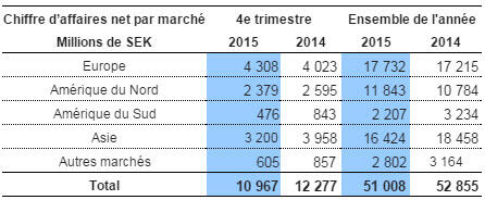 Le résultat d'exploitation, hors coût de restructuration, au cours de la dernière période de l'année s'est soldé par une perte de 191 millions SEK, une amélioration considérable par rapport à la perte de 815 millions SEK enregistrée au cours de la même période de l'année précédente. La marge d'exploitation a également montré des signes d’amélioration, -1,7 % pour la période, en hausse par rapport au -6,6 % du dernier trimestre de 2014. Sur l'ensemble de l'exercice, la marge d'exploitation a été positive, 4,1 %, en hausse par rapport aux 2,3 % de l'année précédente. Ces résultats encourageants ont été obtenus malgré des volumes de vente inférieurs, une faible utilisation de la capacité de production et une provision de crédit de 158 millions SEK en Chine.