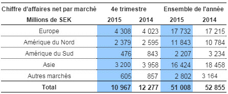 Le résultat d'exploitation, hors coût de restructuration, au cours de la dernière période de l'année s'est soldé par une perte de 191 millions SEK, une amélioration considérable par rapport à la perte de 815 millions SEK enregistrée au cours de la même période de l'année précédente. La marge d'exploitation a également montré des signes d’amélioration, -1,7 % pour la période, en hausse par rapport au -6,6 % du dernier trimestre de 2014. Sur l'ensemble de l'exercice, la marge d'exploitation a été positive, 4,1 %, en hausse par rapport aux 2,3 % de l'année précédente. Ces résultats encourageants ont été obtenus malgré des volumes de vente inférieurs, une faible utilisation de la capacité de production et une provision de crédit de 158 millions SEK en Chine.