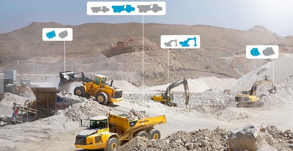 If the number and capacity of machines on site are not correctly matched to the target tons per hour or cost per ton production, excavators could be idling while waiting for a truck to arrive to receive its next load. This burns fuel for no gain. Volvo Site Simulation is a service that models the optimum machine size, quantity, and fleet configuration – even for mixed fleets – to increase productivity and reduce fuel consumption for greater profitability.