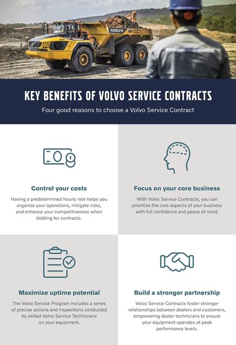 With Volvo Service Contracts, customers entrust the maintenance of their equipment to their reliable local Volvo dealer, allowing them to concentrate on their primary business operations. There’s an added benefit, as fixed maintenance and repair costs facilitate more precise budgeting and fiscal control.