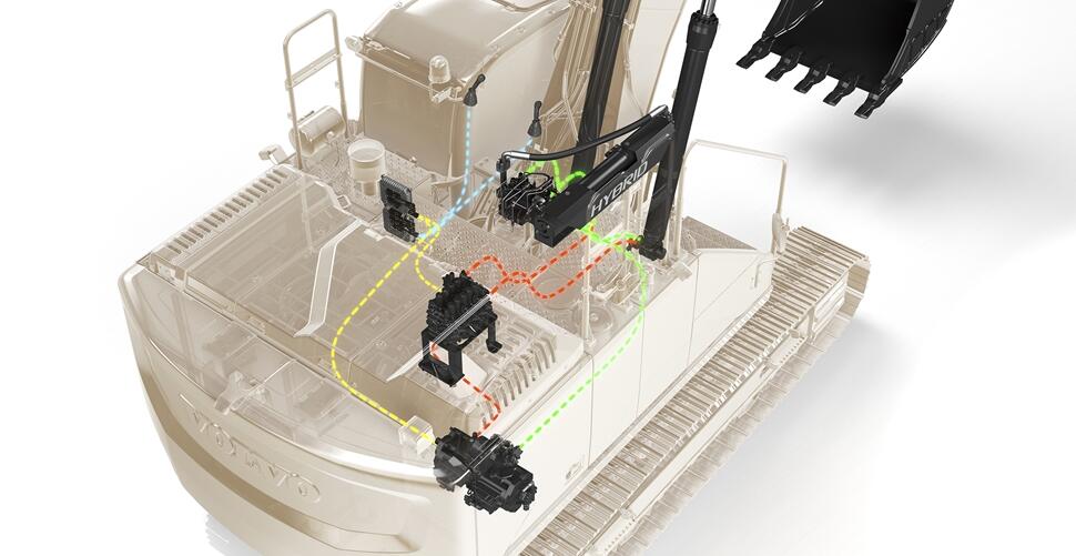 Alle Maschinen der Hybrid-Baureihe nutzen die einzigartige Volvo-Hydraulik-Hybrid-Technologie, die „kostenlose“ Energie aus der Absenkbewegung des Baggerauslegers gewinnt. Mit den kräftigen und regelmäßig erfolgenden Absenkbewegungen des Auslegers wird ein Hydrospeicher mit Druck beaufschlagt, der mit dieser Energie bei Bedarf wiederum den Hydraulik-Hilfsmotor zur Unterstützung des Motorsystems antreibt. Bei den Hybridmodellen gibt es keine Kompromisse in Bezug auf die Leistungsfähigkeit, denn diese Bagger bieten das gleiche Maß an Steuerbarkeit und Leistung wie Maschinen ohne Hybridantrieb.