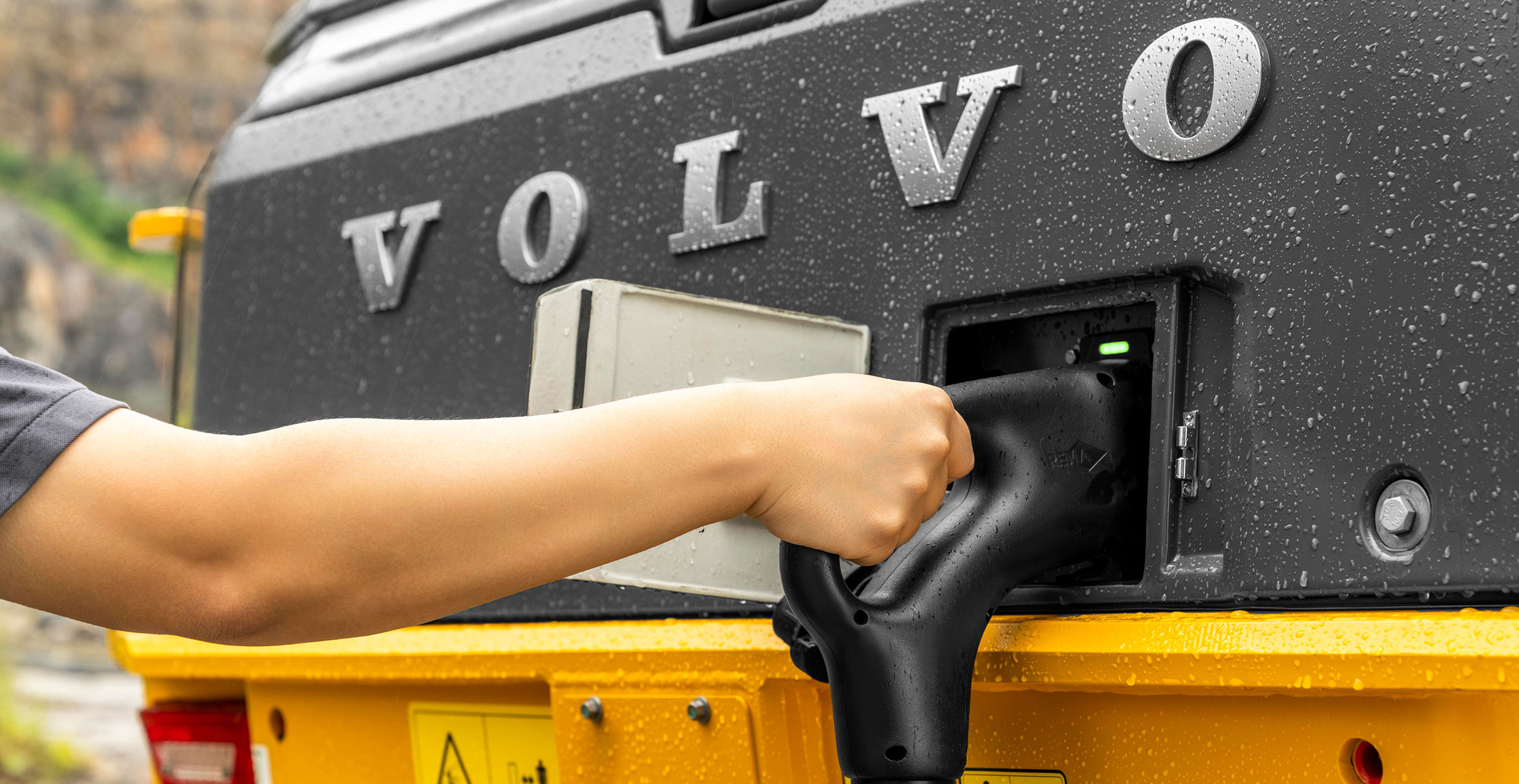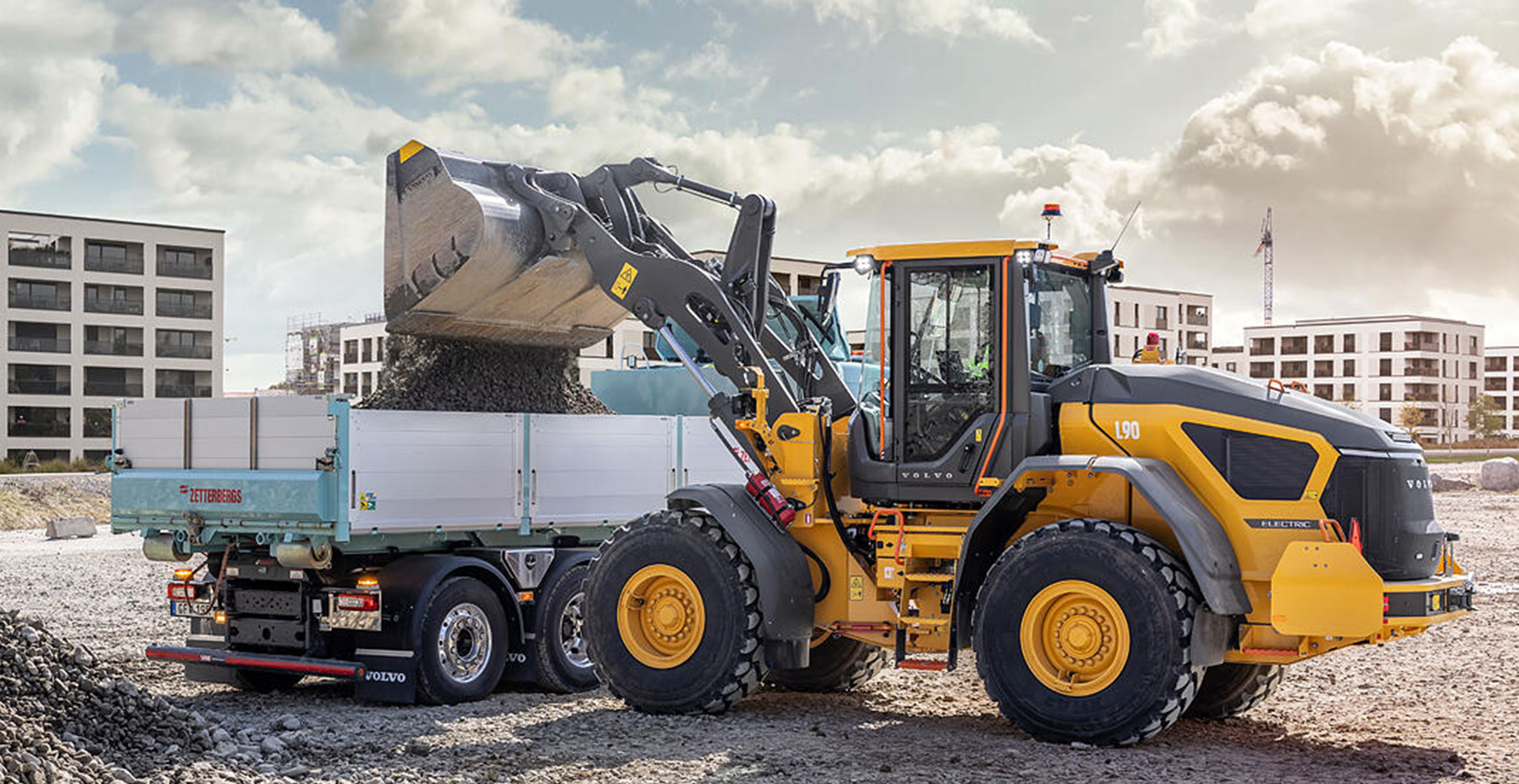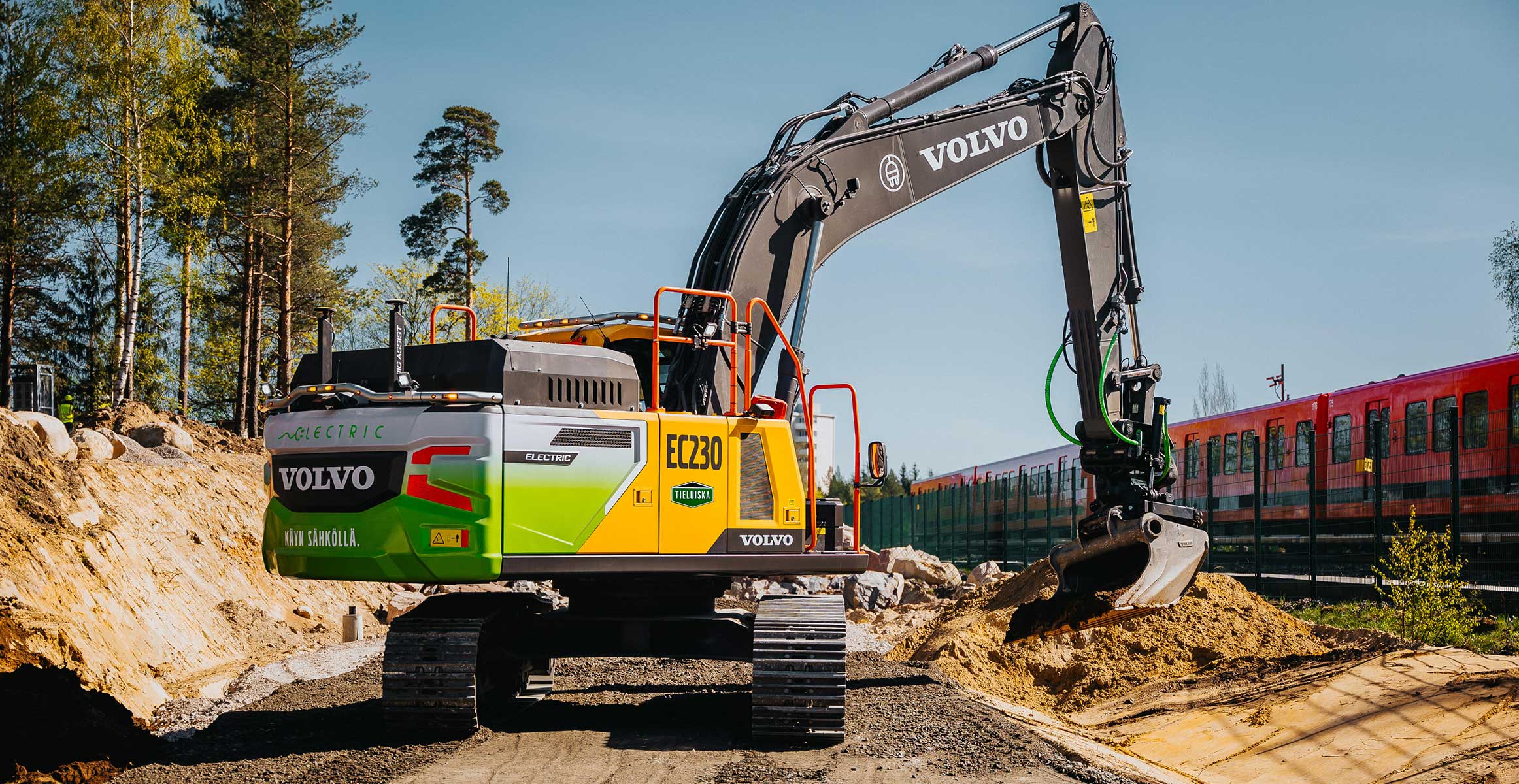 Three electric machines from Volvo CE, including two Volvo EC230 Electric crawler excavators and one L120H Electric Conversion wheel loader, are working to lower the ground, excavate approximately 68,000m³ of soil and rock, fill in a work tunnel, and prepare the area for utility systems.