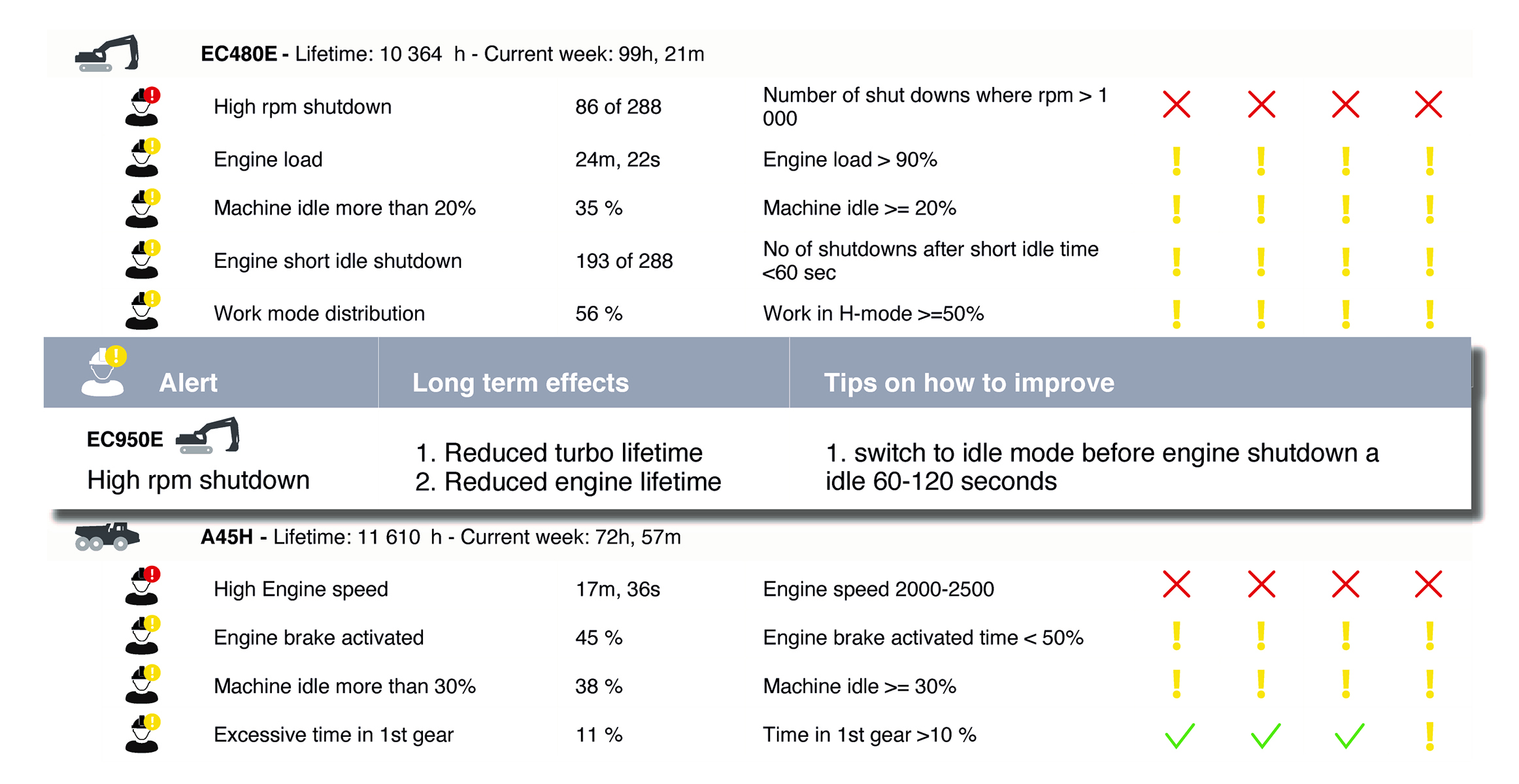 Stay up-to-date on how your machine is being used and identify areas to reduce strain on the machine. For each operating alert, the report includes an explanation of the long-term effect, as well as tips on how to avoid it.