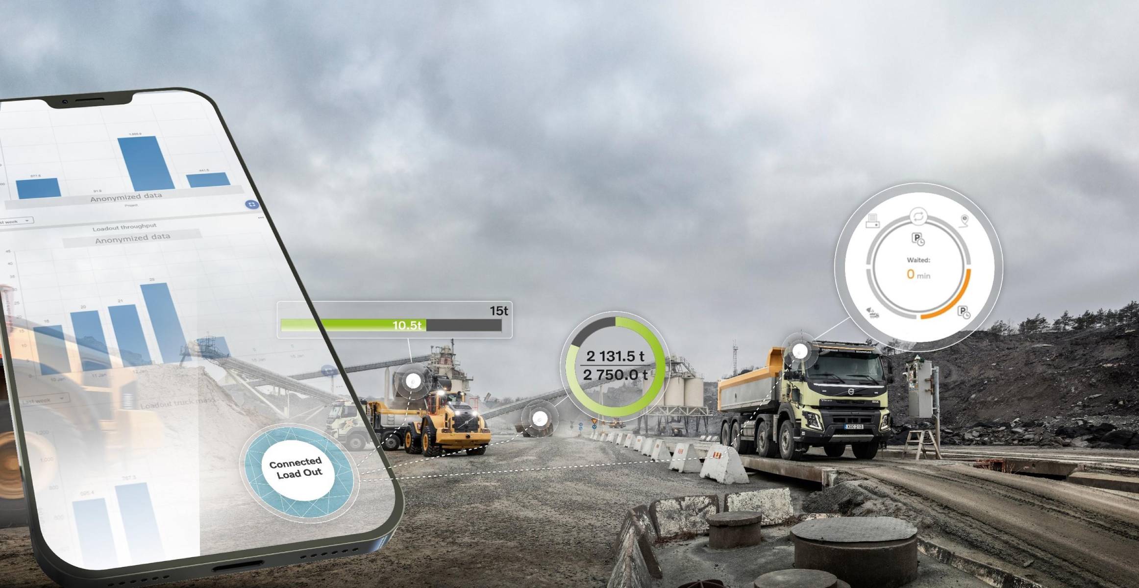 Connected Load Out is designed to improve the efficiency and productivity of the load out process by connecting the loader operator, site office and trucks. It is a digital solution for Volvo wheel loaders with Load Assist and On-Board Weighing and Volvo excavators with Dig Assist On-Board Weighing.