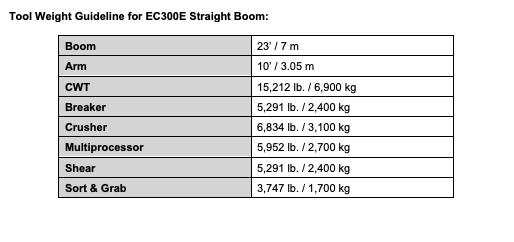 The EC300E Straight Boom comes with several standard features that are valuable in demolition applications. These include X1 and X3 auxiliary piping, a quick fit and oil drain line, and water lines that are connected to a dust suppression system that can work in either auto or manual mode. A heavy counterweight provides balance and is easily removable for transportation.