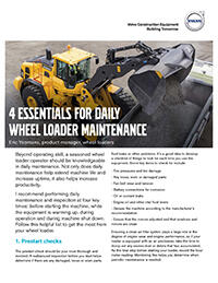 I recommend performing daily maintenance and inspection at four key times: before starting the machine, while the equipment is warming up, during operation and during machine shut down. Follow this helpful list to get the most from your wheel loader.