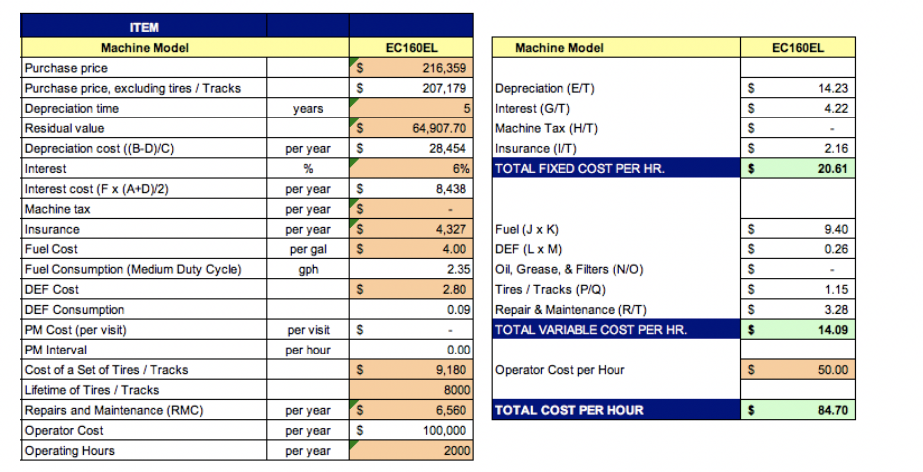The above image can serve as a general guide to estimating a machine’s total cost per hour. There are 20 rows on the image, and all are important to calculating TCO.