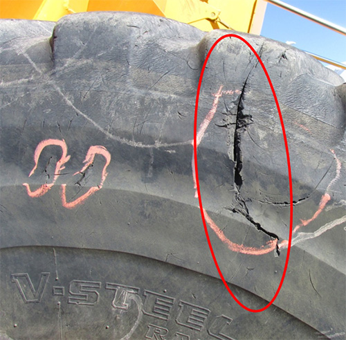 Tread/Sidewall Cuts: If you see some, determine if they’re superficial or serious. Use a tool like a depth gauge to measure how deep the cut is. It depends on the width of the sidewall, but a good rule of thumb is a cut that’s a quarter inch or more is likely a sign of a problem. This isn’t just a performance issue. In mining applications, you can be fined and/or required to replace tires with cuts.