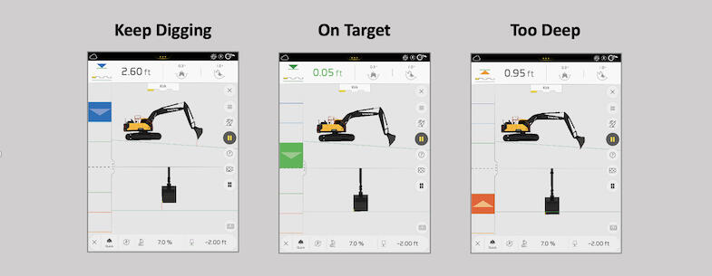 You don’t have to actually watch the screen while you’re working, you can simply reference the light bar out of the corner of your eye. When you see blue, keep digging. If you see green, you’re on grade. If you start seeing yellow or orange, you’ve dug too far and need to back off. If you’d rather have a sound tell you you’re on grade, you can turn that feature on. It’s that simple.