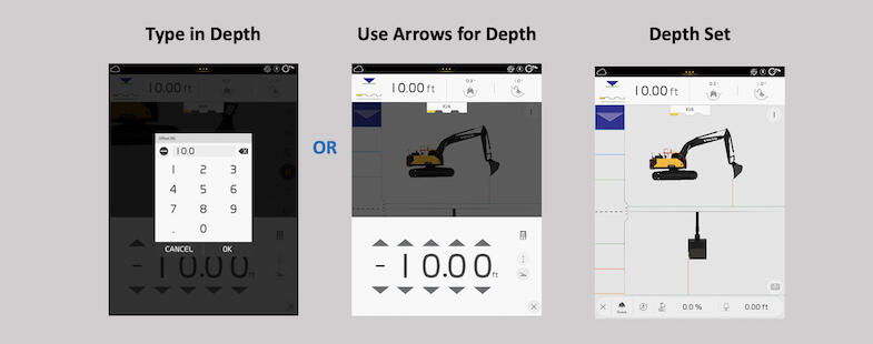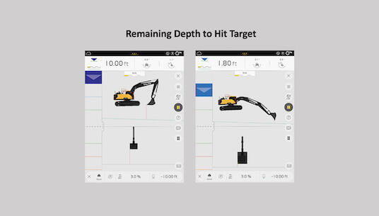 With Start, you simply touch the bucket to the ground and tell the machine how far down you want to dig and at what angle. The screen will show you how far away your bucket is from the target depth (the horizontal green line) and provide a light bar to help you gauge how close you’re getting with each pass.