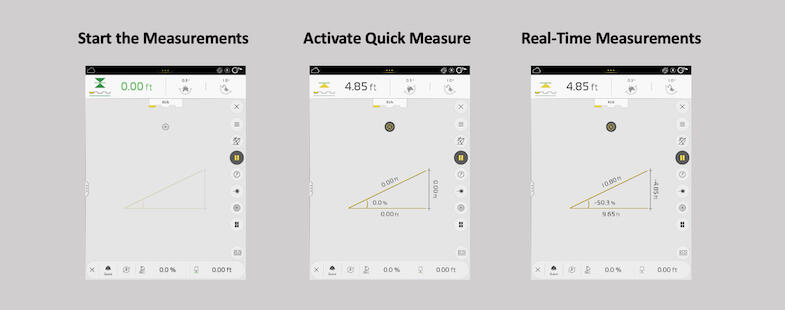 In this side-by-side graphic, you can see that the left represents where you would hit “+” to activate Quick Measure.” The middle picture shows Quick Measure is on, but the tooth hasn’t moved it yet — the distances are 0. The right side shows after you’ve moved the bucket (the screen gives you a live reading) — these dimensions represent the distance between point A and point B, etc.