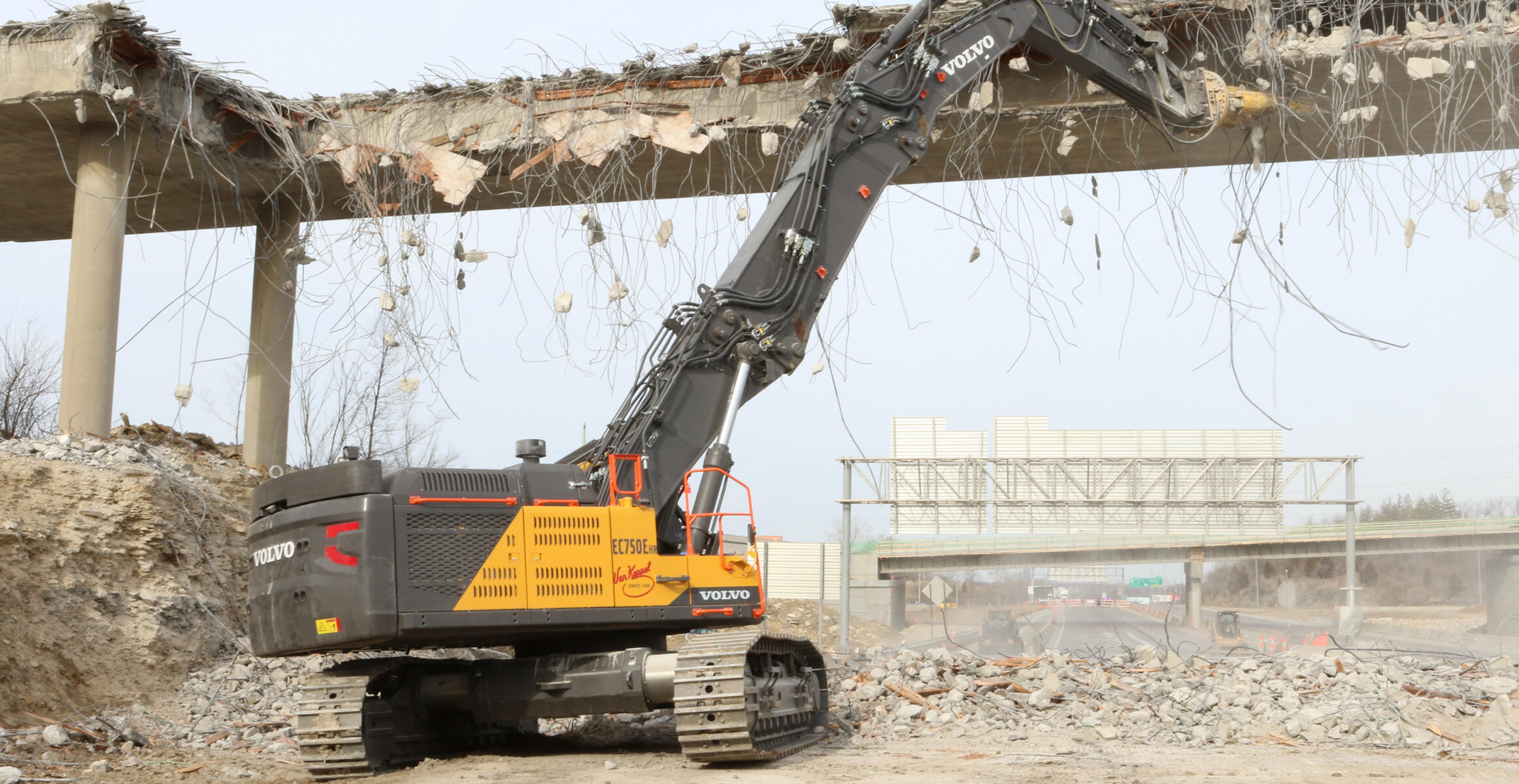 Shorten said the Volvo EC480 HR ran a 10,000-pound NPK-E225 hoe ram to break the vertical walls of the bridges, while the 750 worked behind it using an Epiroc CC6000 Combi Cutter attachment to crunch the horizontal slabs and 1.5-inch rebar. The 480 also hammered down the pillars.